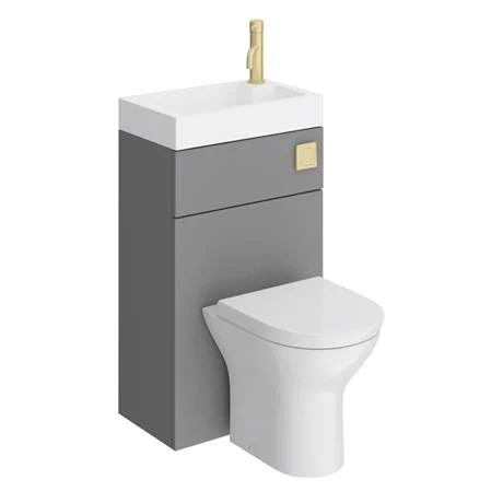 Short of space in your bathroom? the Arezzo Matt Grey Two-In-One Wash Basin and Toilet offers a stylish solution. This innovative design consists of a toilet with a sink on top – all pipework is neatly concealed inside a sleek matt grey unit with a brushed brass flush for a streamlined look. The built-in sink offers ample room for your chosen tap, while a practical soft close toilet seat shuts almost silently with a simple touch.