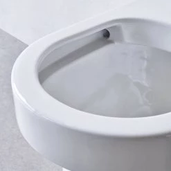 This Britton Shoreditch round close coupled toilet features a short projection that is ideal for smaller bathrooms and has an open back that allows for turned outlet pipes. It’s rimless design ensures the toilet is super simple to clean and maintain. The cistern flushes at an economical 6/3 litres while the toilet seat is fitted with soft close hinges and can easily be removed for cleaning. The brushed brass flush button makes it easy to coordinate with other brass fittings and taps.