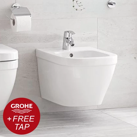 The Euro ceramic complete wall hung bidet package is the perfect upgrade for any contemporary bathroom. The package consists of a contemporary, minimalist wall hung bidet, tap and waste. The bidet is manufactured from high grade vitreous china and finished in Alpine White. The stylish EuroSmart bidet tap is supplied with an integrated pop-up waste and features GROHE’s StarLight chrome finish and a Longlife 28mm ceramic cartridge.
