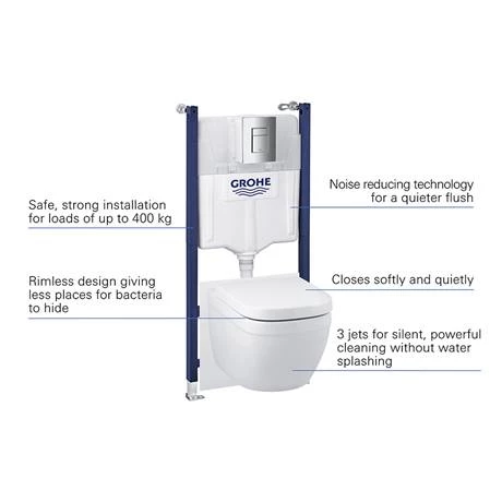 The Grohe Solido Euro Ceramic Compact 5-in-1 Pack offers a complete solution for a wall mounted toilet and leaves nothing to be desired. It comes complete with the GROHE Euro compact wall-hung WC with seat, the chic Skate Cosmopolitan flush plate in gleaming GROHE StarLight chrome finish, wall brackets and noise protection set for extra sound insulation. GROHE Whisper noise control reduces sound transmission caused by flushing to adjoining rooms. The GROHE EcoJoy flush technology reduces your water consumption by up to 50%: The dual flush system allows you to select a flush volume of either 3 or 6 litres and itâs possible to stop a full flush with the small button.