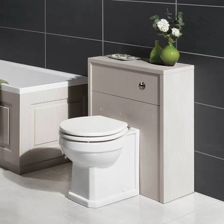 A period style 500mm back to wall WC unit with pan and matching seat, the chic stone grey woodgrain finished York WC unit features a elegant smooth white gloss toilet with a bottom fixing white wooden toilet seat.